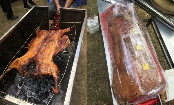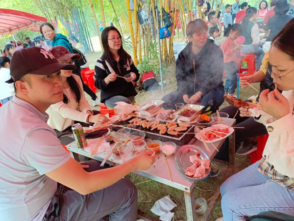 11:30體育運動結(jié)束后,大家來到燒烤場進行自助燒烤。燒烤場座落在綠蔭濃濃的竹林中,雖是冬日,卻煦日暖暖,溫和的陽光打在竹葉上,落下斑駁的日影,清風(fēng)襲來,沁人心肺。燒烤場里飄香四溢的烤全羊、外酥里嫩的烤香豬、肥肥的雞腿、嫩嫩的雞翅、勁頭十足的牛肉丸,還有火腿、茄子、玉米、青椒等早已備好,此時大家早已饑腸轆轆,便迫不急待地動起手來,“自力更生”,喂飽自己的肚子! 大家團坐在烤爐旁,你遞個調(diào)料,我刷下辣醬,互幫互助,默契盡在不言中,其實,這也是一種心靈的溝通與交流。